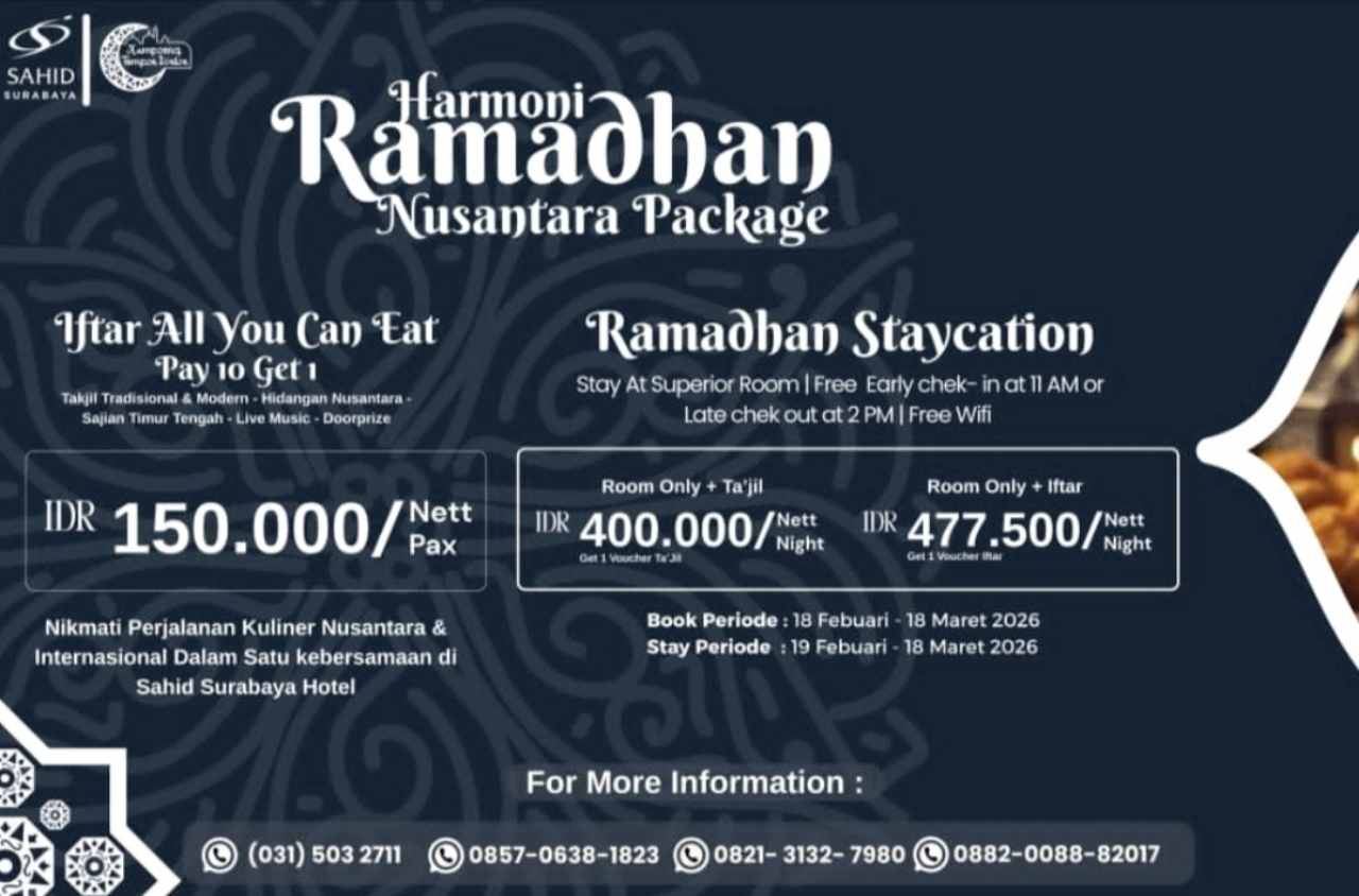 KILASJAVA.ID, SURABAYA – Industri perhotelan kembali memanfaatkan momentum Ramadan untuk menghadirkan paket tematik. Sahid Surabaya Hotel meluncurkan program Ramadhan Staycation, menyasar tamu keluarga maupun pebisnis yang ingin menikmati suasana bulan suci tanpa meninggalkan pusat kota.
